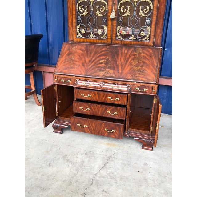 Maitland Smith Bookcase. Maitland-Smith Napoleon Brown Finished Bookcase With Ladder, Crotch Mahogany Veneer, Brass Accents. Maitland Smith drop front bureau bookcase.
